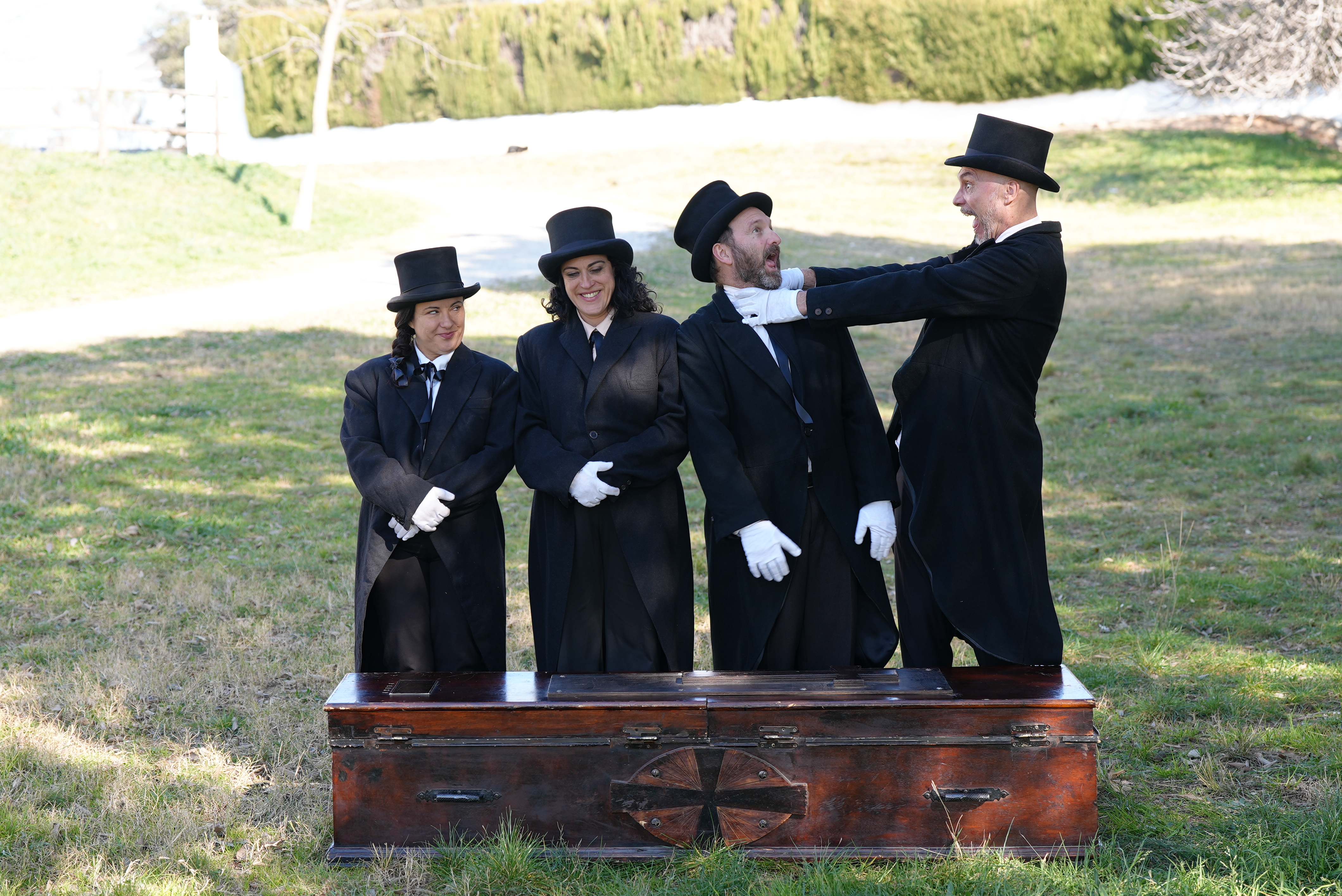 Quatre enterradors es passegen per la ciutat amb un taüt a la recerca del lloc idoni pel seu particular photocall. Un fun-eral itinerant que dona vida a la mort.