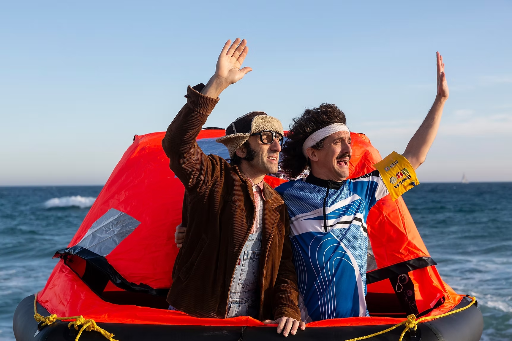 Dos personatges arriben, amb un bot salvavides, preparats per al dia de la gran inundació.