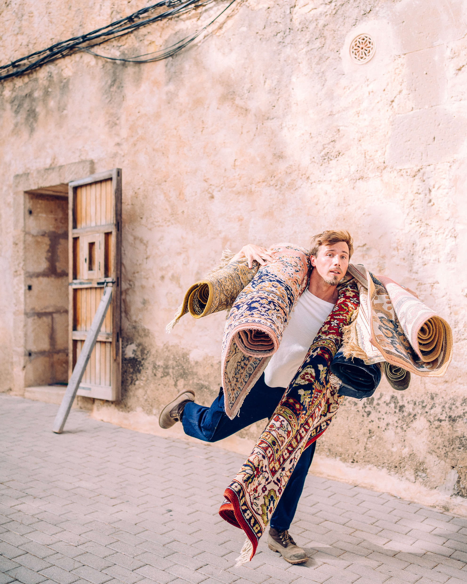 L'actor és un titellaire, que volta pel món amb el seu escenari portàtil carregat a l'esquena, com si fos una motxilla.