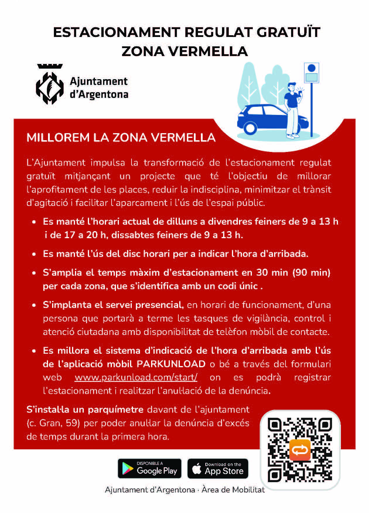 L'Ajuntament d'Argentona posarà en marxa un projecte de transformació de l'estacionament regulat gratuït a la Zona Vermella. Aquesta iniciativa té l'objectiu millorar l'aprofitament de les places, reduir la indisciplina, minimitzar el trànsit d'agitació i, en definitiva, facilitar l'aparcament i l'ús de l'espai públic per a tota la ciutadania.