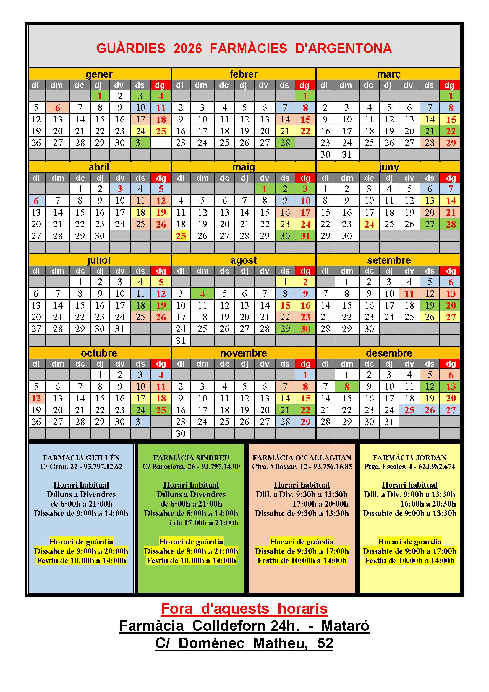 CALENDARI FARMÀCIES DE GUÀRDIA 2026